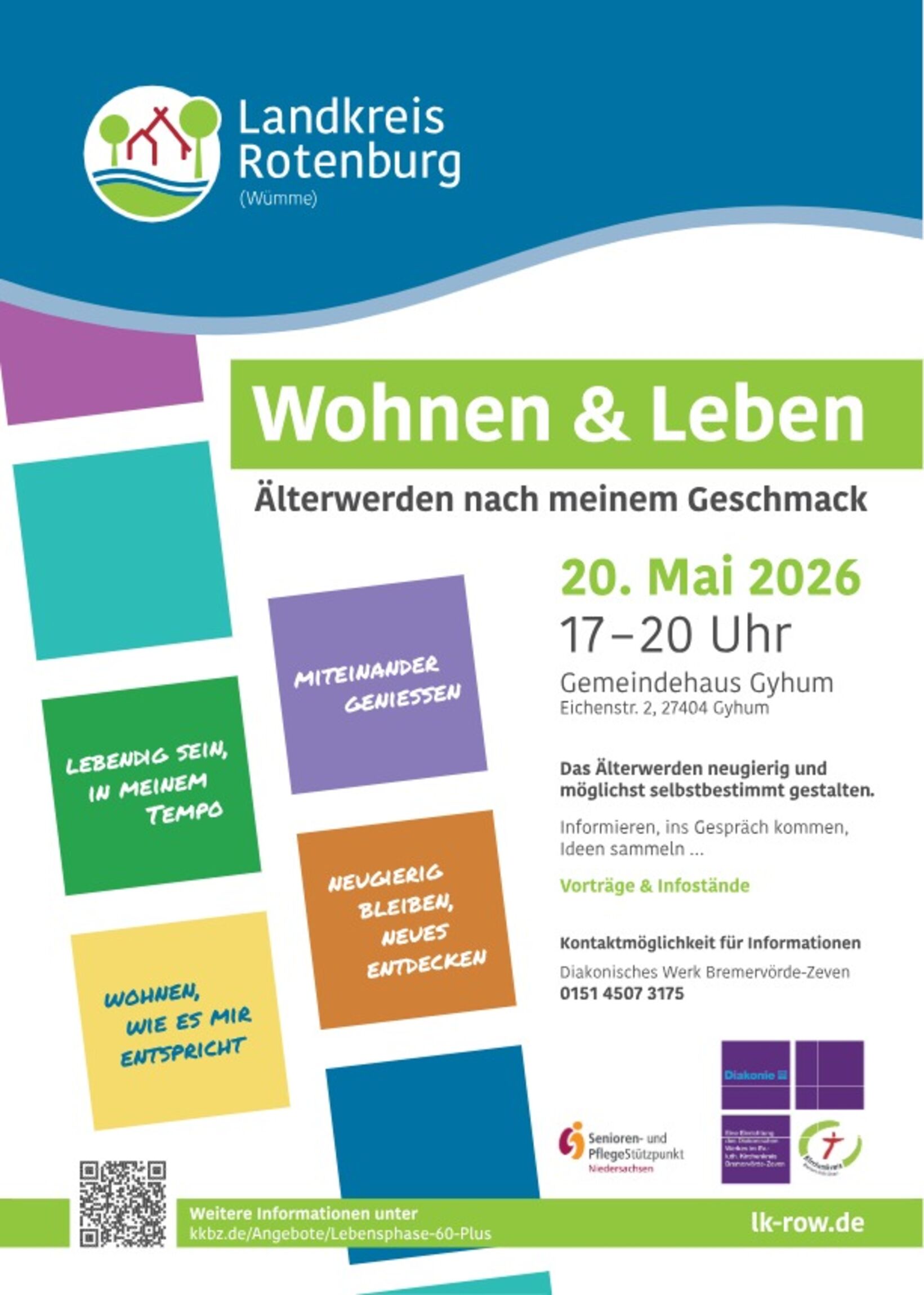 Wie möchte ich leben, wenn ich älter werde? Diese Frage stellen sich viele Menschen irgendwann – oft leise, manchmal mit Sorge, manchmal mit Neugier. Die Veranstaltung „Wohnen & Leben – Älterwerden nach meinem Geschmack“ setzt hier an. Am Mittwoch, 20. Mai 2026, von 17.00 bis 20.00 Uhr, findet im Gemeindehaus in Gyhum eine offene Veranstaltung dazu statt.